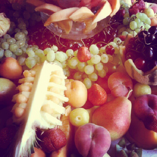 In 5 minuti ho scattato questa foto, rielaborata in Instagram, dunque ho aggiutno dei filtri e l’ho condivisa su FB e Twitter. Era per il compleanno di mia mamma. Un amico le ha preparato come dessert questa “scultura di frutta”… io ne sono rimasta davvero affascinata!